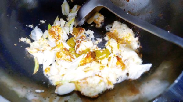 蛋清凝固后炒散,加入葱姜蒜青泡椒倒炝锅