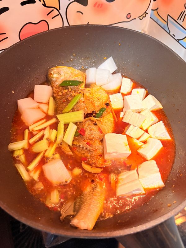 再放入鱼和自己喜欢的配菜(也会不放菜)、因为我放了萝卜炖的时间就久、正常闷4分钟就可以了(大火收汁)再放点味精和香菜出锅。