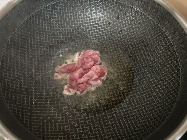 加入1勺金龙鱼外婆乡小榨菜籽油勺,油热加入切好肉片