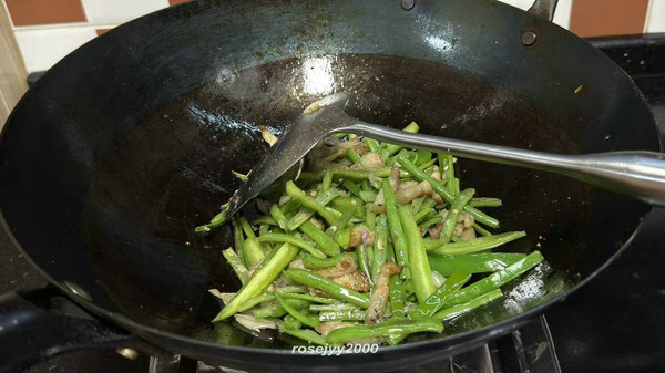 起锅升中大火,锅热加菜籽油2大勺,倒入四季豆;