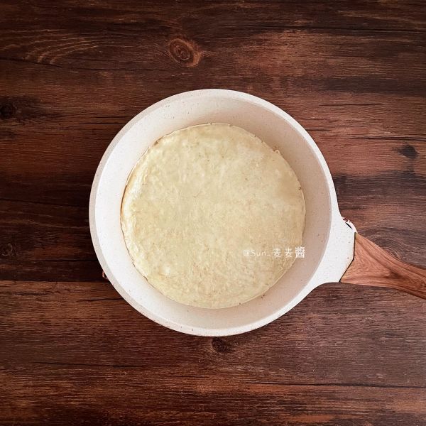 油热后倒入适量面糊,迅速转下平底锅,让面糊铺平