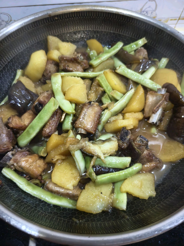 不断翻炒,排骨微黄,放葱,姜,蒜,花椒