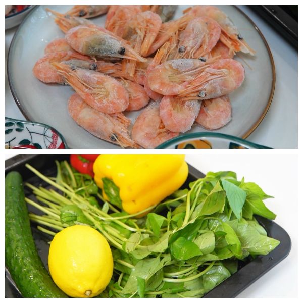 加拿大北极虾常温解冻, 所有蔬菜清洗干净。