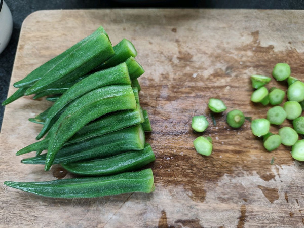 7.煮好的秋葵切去蒂,(先煮再切,避免营养流失)