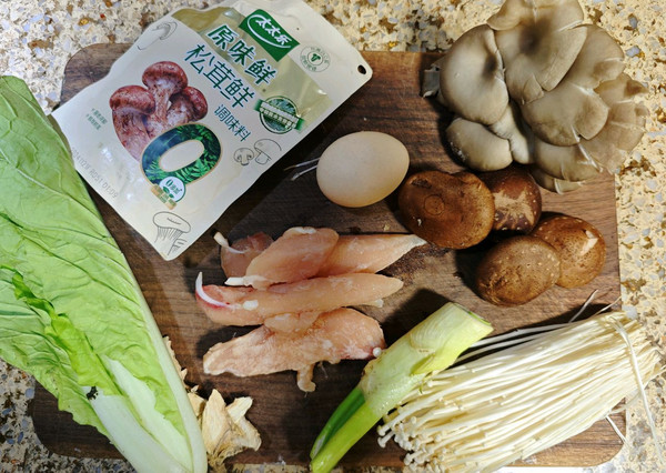 准备好食材(小白菜,鸡胸肉,香菇,葱,金针菇,平菇,鸡蛋,松茸鲜)