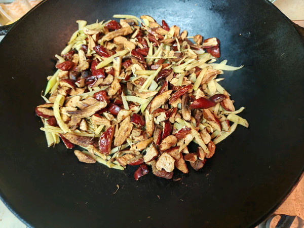 铁锅加热,下入姜丝。这时候姜丝发出滋啦滋啦的水汽响声。