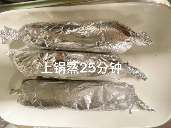 把豆皮,卷成长条状后,用锡纸包起来,锡纸头尾两边记得旋紧,蒸的时候内馅跟豆皮才能很好的粘在在一起不散开。