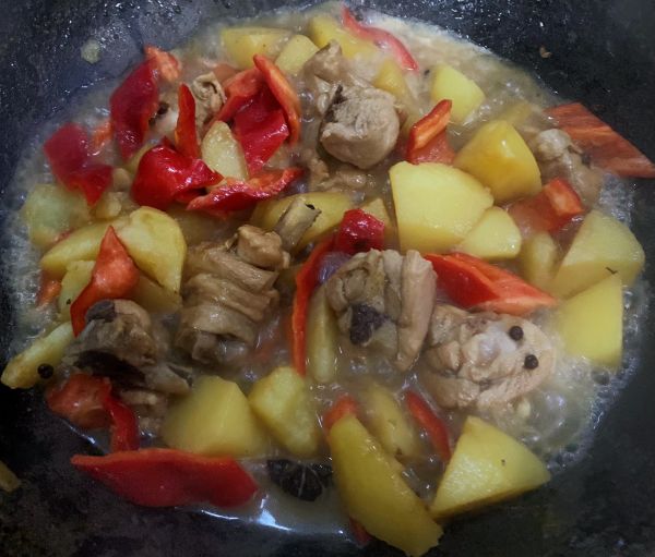 炖至汤汁不多时放入红椒快速炒匀。
