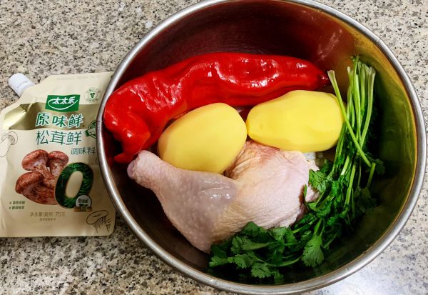 准备原材料鸡腿、土豆、红椒、香菜、经典调味料太太乐松茸鲜。