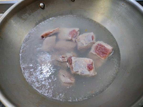 首先是仔排洗干净冷水下锅煮沸后再1分钟关火,捞出冲洗干净备用。