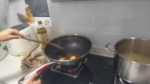 热锅冷油,小火炒姜片和干辣椒,然后放入焯水焯好的翅根等,煎至金黄色(这步可以关火放翅根,因为会喷油,一定小心!!!);