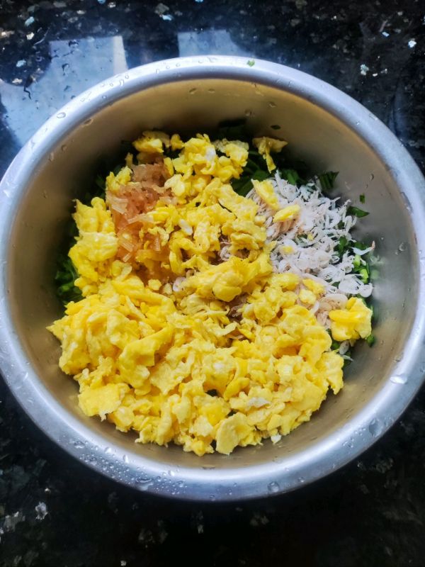 韭菜洗净沥水,切碎,放入泡好的粉丝粒,虾皮,鸡蛋碎,搅拌一下