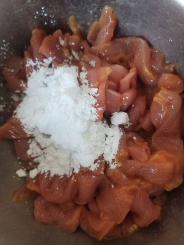 里脊肉切片,放入红梅料酒,抓到料酒吸收;