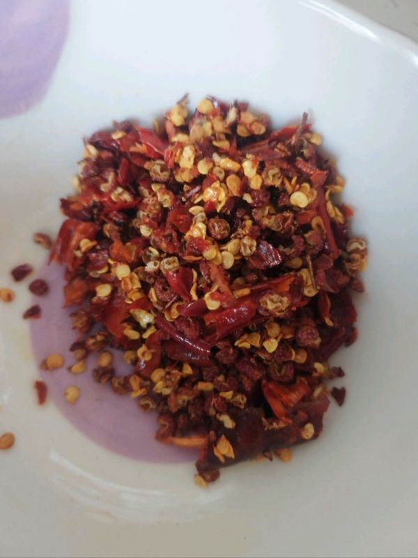 锅内喷一点油,放入干辣椒和花椒,炒到花椒变成枣红色盛出晾凉;