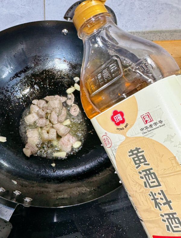 翻炒几下,让红梅黄酒料酒入味。