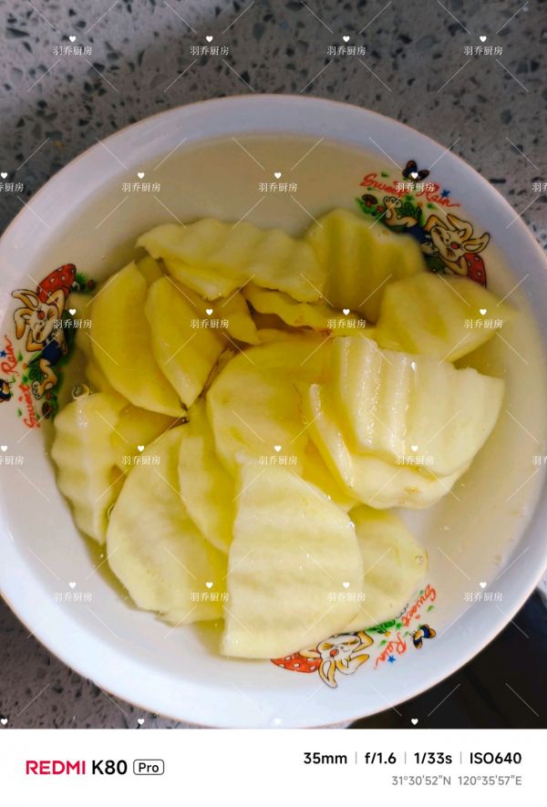 土豆切成薄片,放进清水里浸泡20分钟,中途可抓拌,多次换水。洗去表面淀粉,然后控干水分。