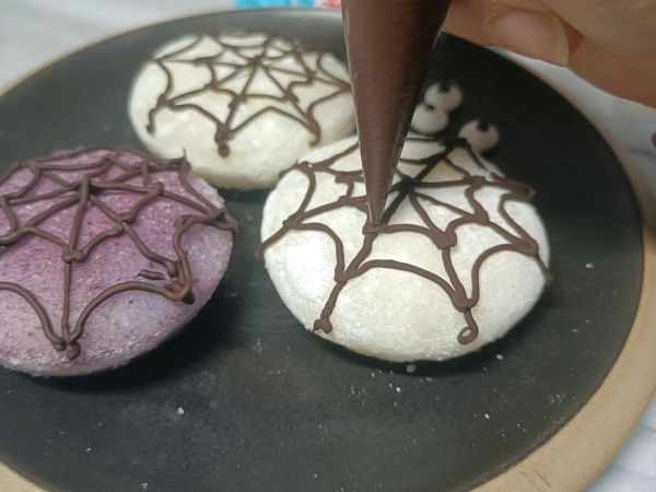 巧克力口味的雪滋放上巧克力币,用融化的巧克力画出腿,放上眼睛糖珠