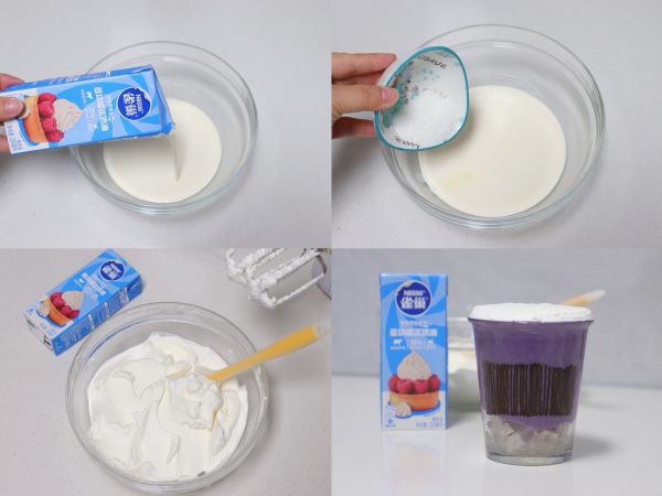 打发好的奶油在杯顶挤出云朵造型,即可。