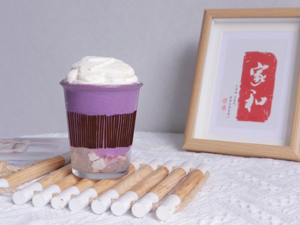 杯底放入适量脆啵啵,切好的芋头丁,打好的芋泥用勺子舀入杯中,与杯口齐平,抹平。