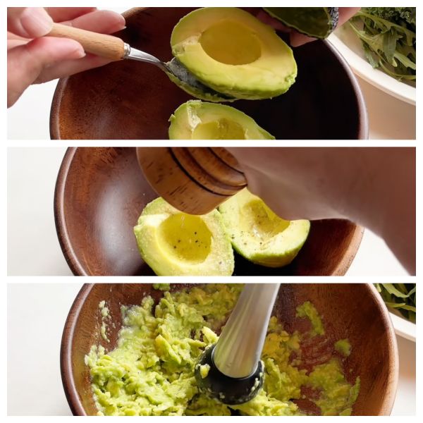 牛油果取出果肉,放盐、黑胡椒、柠檬汁压碎做成牛油果酱。
