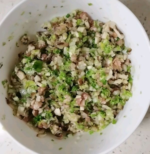 白菜切细后撒一勺盐,静置一会儿,倒在笼屉布里挤出水份,肉糜先用六月鲜拌匀,香菇切小丁,最后加葱花和麻油