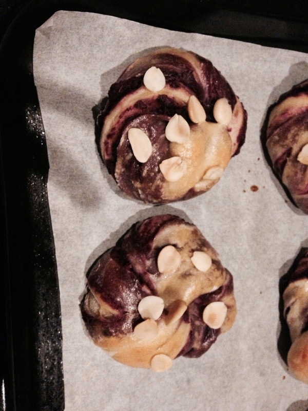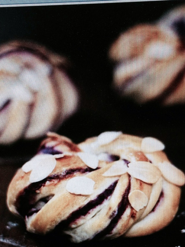 再次发酵到两倍大。刷一层蛋液,撒上杏仁片,烤箱175度预热,烤13-15分钟。