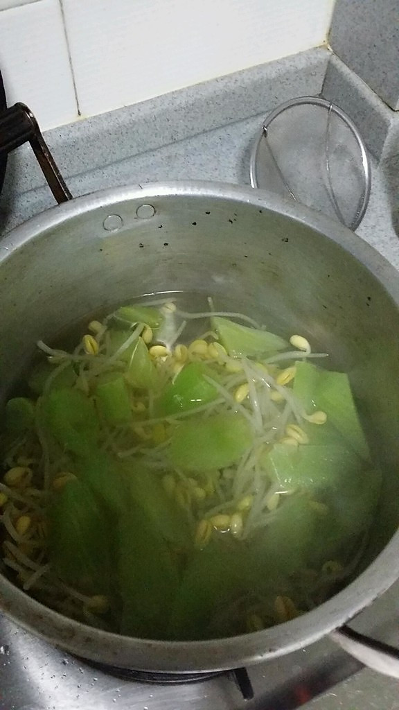 生姜切片,蒜切末,莴笋去皮去叶切块,豆芽洗净,备用