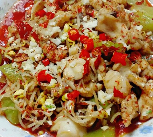 盛出后撒上辣椒面和蒜末。
