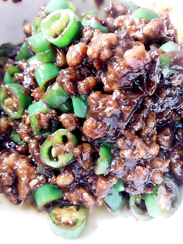 转小火熬制,出锅前放入杭椒碎,即成杭椒杂酱