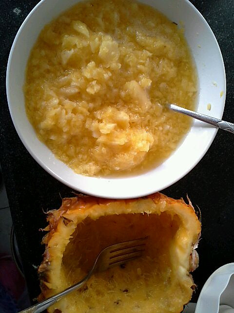 菠萝 清洗干净外壳,三分之二处切开挖干净菠萝肉盖子也挖干净肉注意别挖漏了