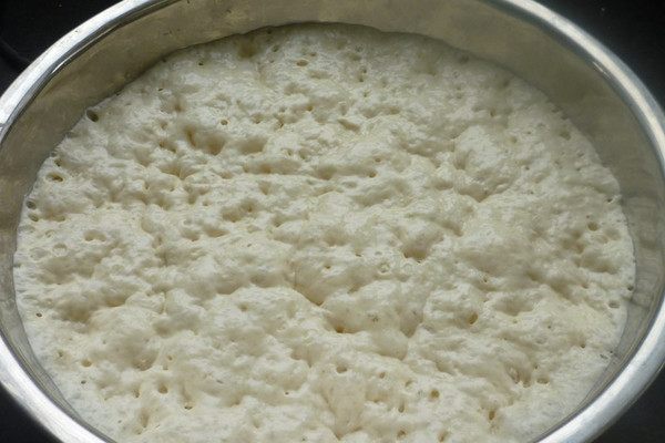 将主料中的原料混匀,放温暖处发至膨胀后回落,内部呈蜂窝状
