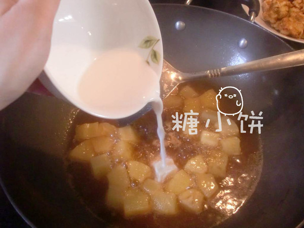 宽锅热油,放入浆制好的鸡肉块半煎半炸