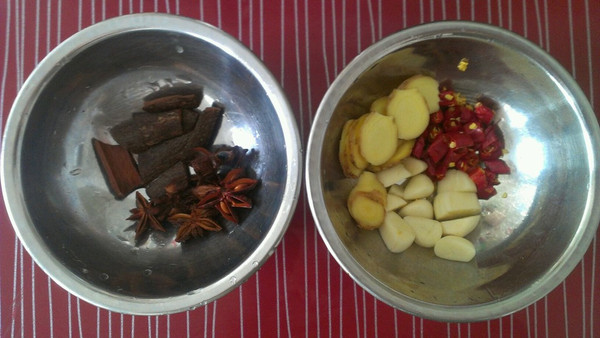 准备桂皮、八角、生姜片、大蒜头、干辣椒、香叶洗干净备用!