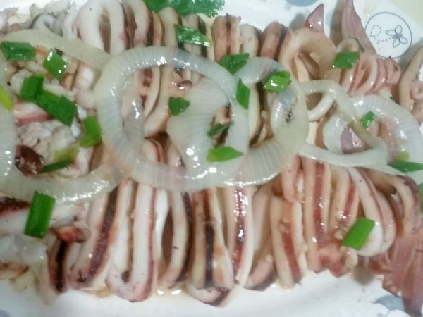 蒸好后取出鱿鱼摆盘,可以用稍稍过油的洋葱圈装饰一下,滴几滴香油即可。