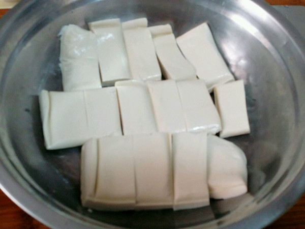 豆腐切块,铺在盘底。