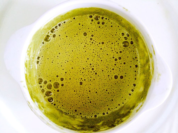 将香草牛奶液1倒入蛋黄抹茶液3中,分少量多次倒完,边倒边搅拌,直到搅拌均匀。
