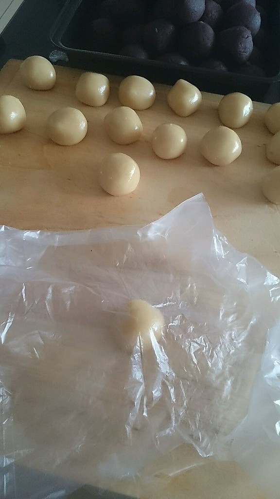 转化糖浆,花生油,枧水混合均匀,加入中筋粉,揉成团,醒30-60分钟。分成15g左右的小份,豆沙35g一小份,这里饼皮和馅料比例3:7,相对好包一些。请忽略我的数量,大批量的月饼……